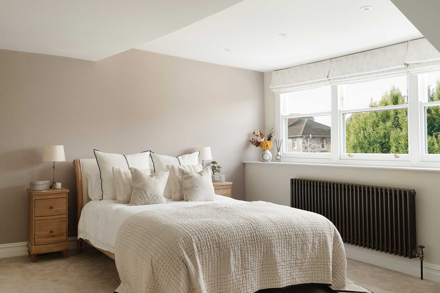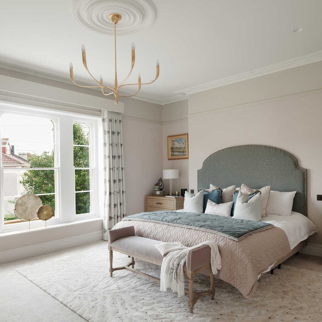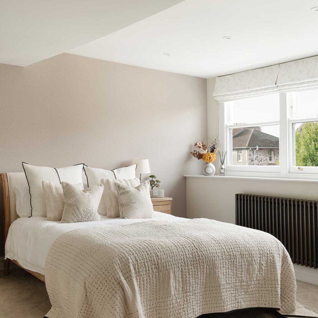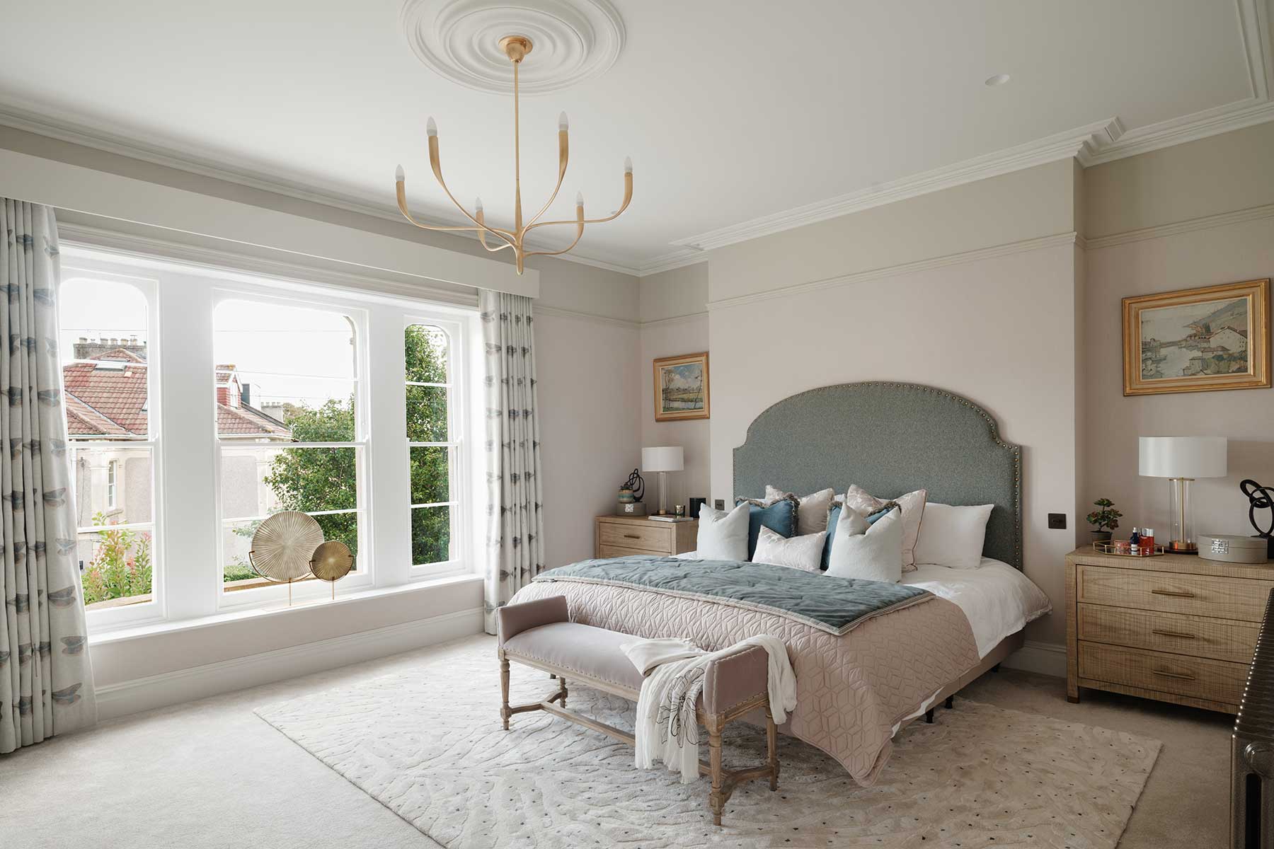 The master bedroom, in contrast, was generously proportioned. We flipped the layout, positioning the bed against the chimney breast rather than forcing narrow wardrobes into the alcoves. This gave space for a wall-to-wall wardrobe with a detail we love: a concealed dressing area with pocket doors and a vanity, keeping everything calm, functional and beautifully tidy.