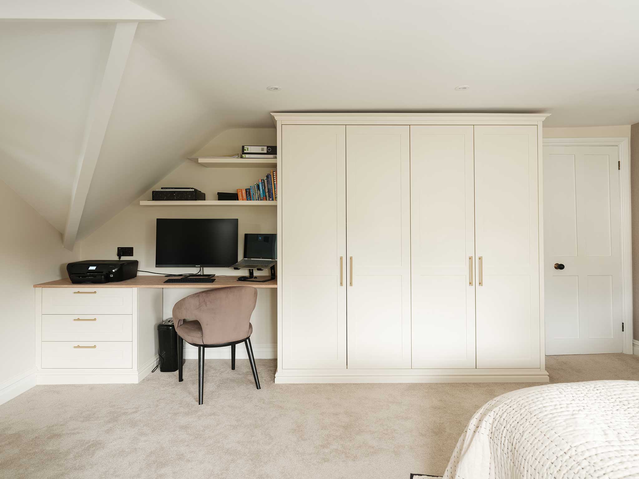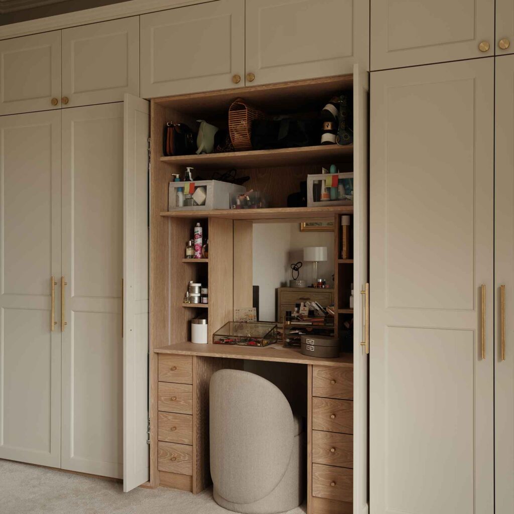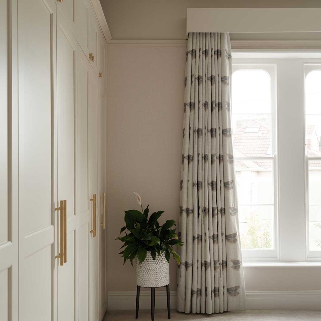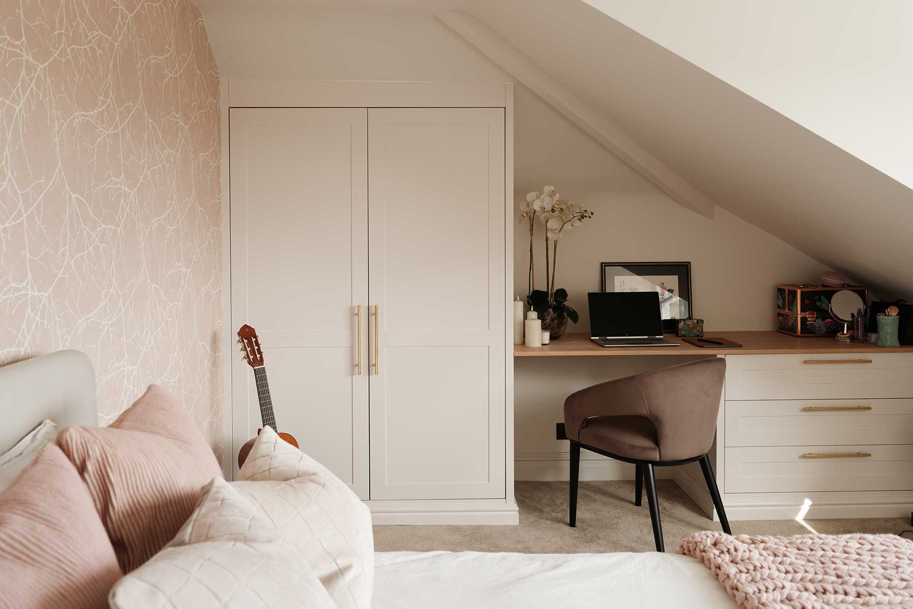 The master bedroom, in contrast, was generously proportioned. We flipped the layout, positioning the bed against the chimney breast rather than forcing narrow wardrobes into the alcoves. This gave space for a wall-to-wall wardrobe with a detail we love: a concealed dressing area with pocket doors and a vanity, keeping everything calm, functional and beautifully tidy.