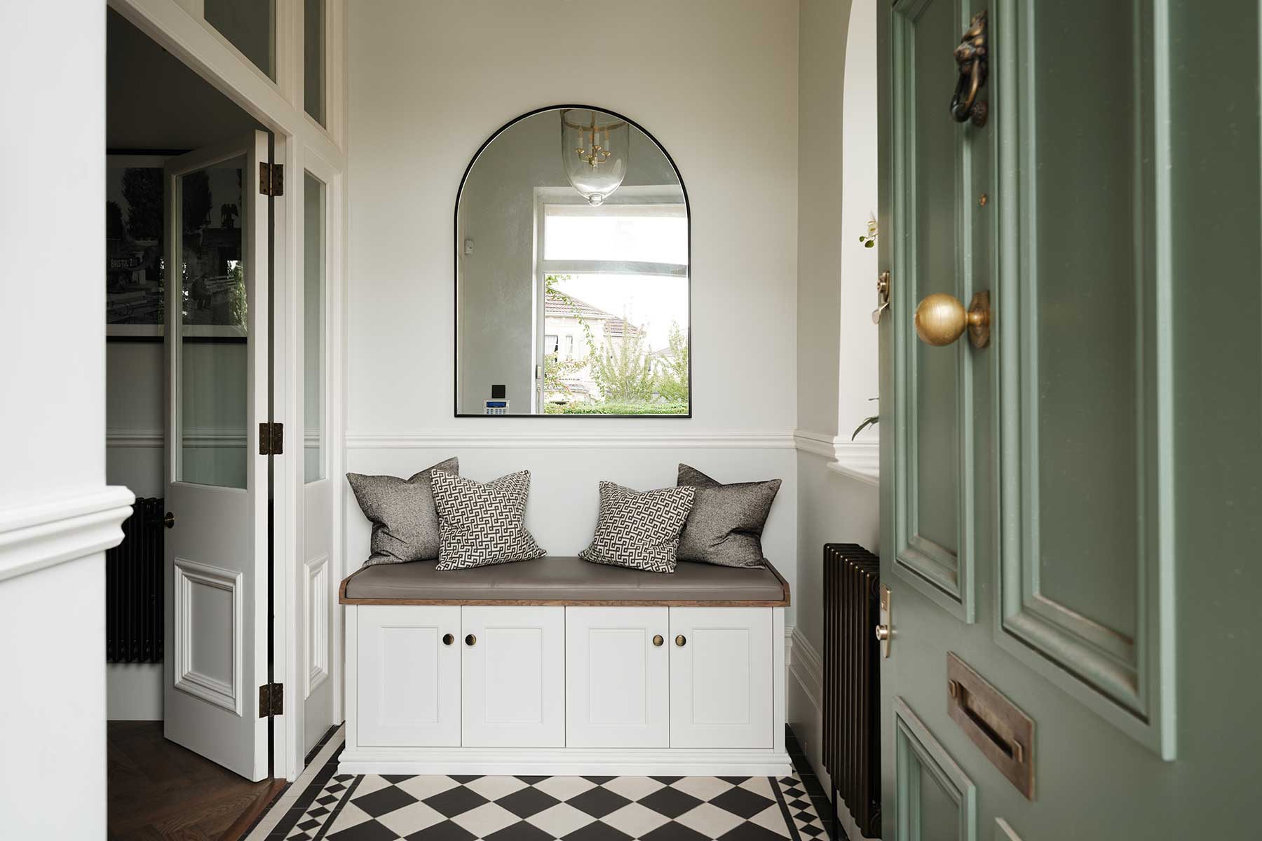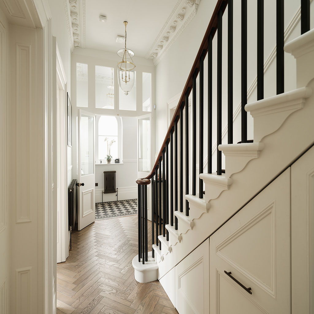 The entrance porch sets the tone with traditional black-and-white tiles, while the staircase has been reimagined with slim metal spindles and a mahogany handrail — a bridge between classic and contemporary. And where family life might once have spilled into the hallway, bespoke under-stairs joinery now swallows shoes, coats and bags with ease.