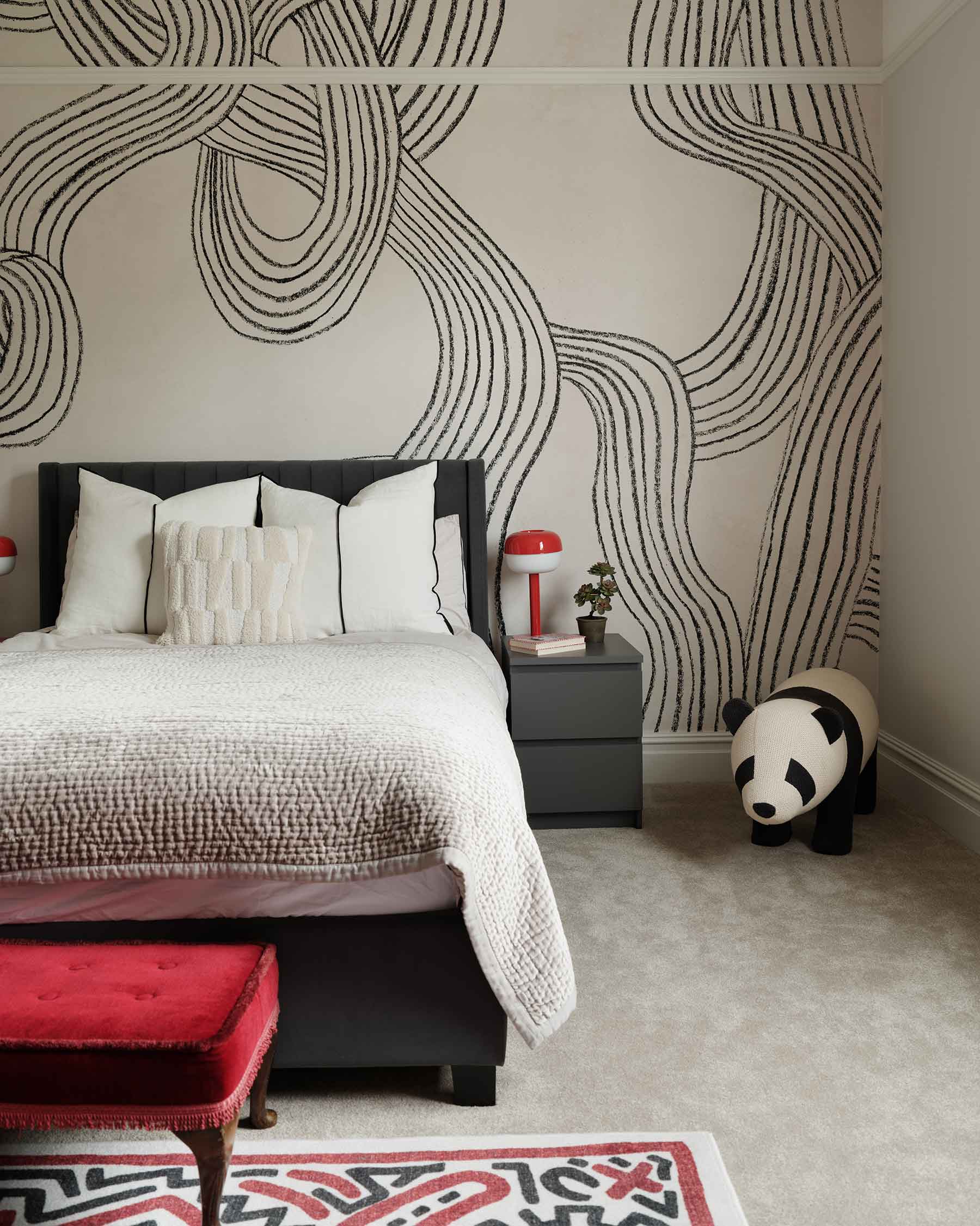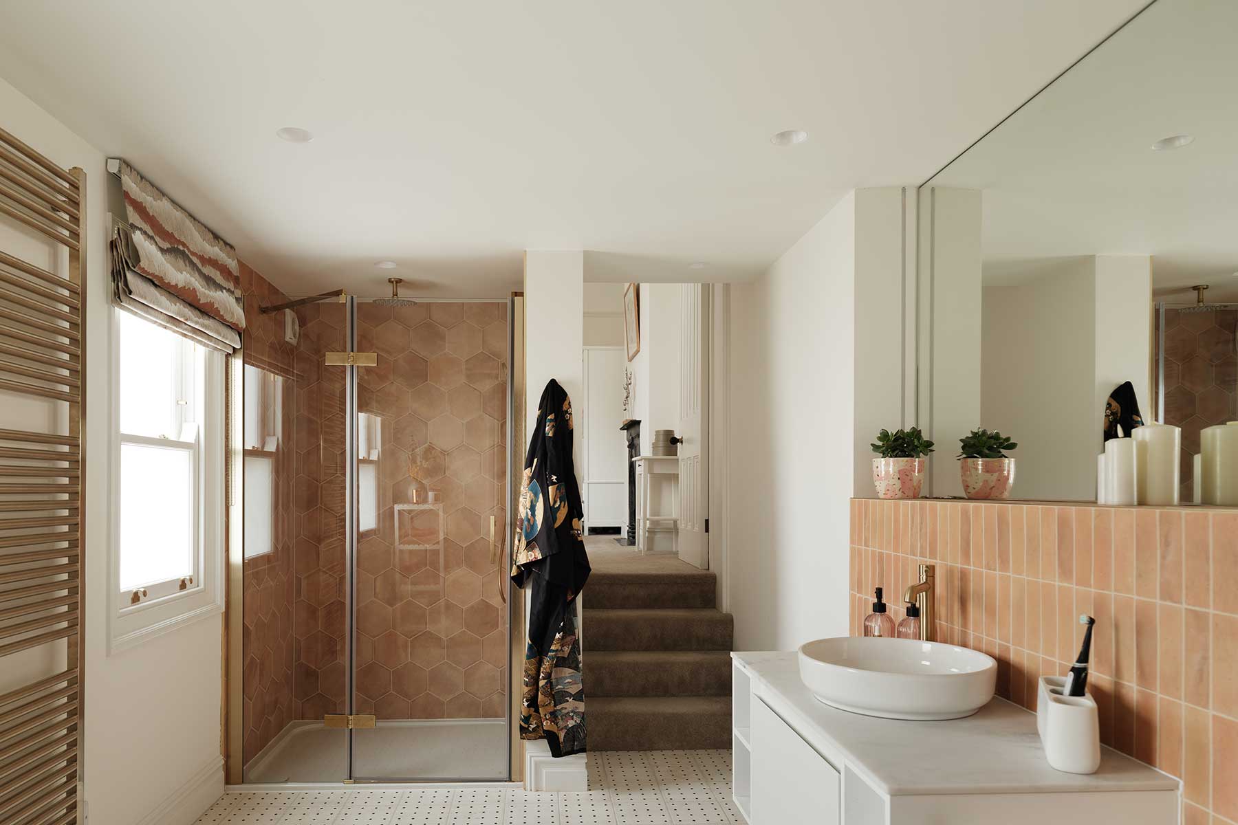 The first floor comprises three bedrooms, including one with an en-suite above the extension. While we created calm, colour-led bedrooms tailored to the children’s preferences, the real challenge lay in the family bathroom.