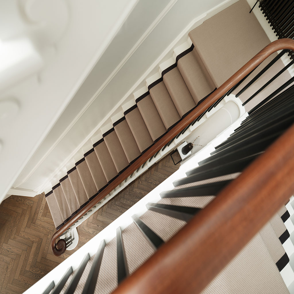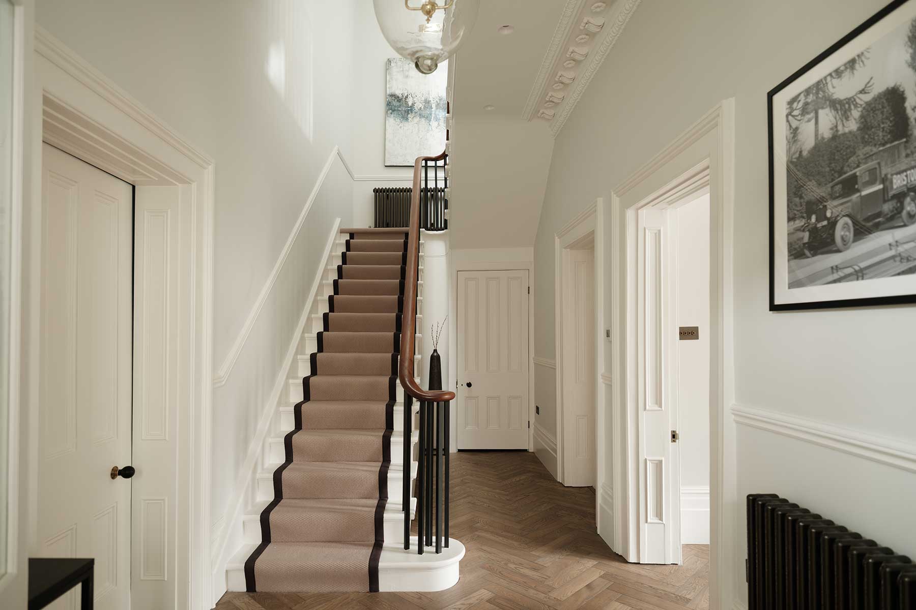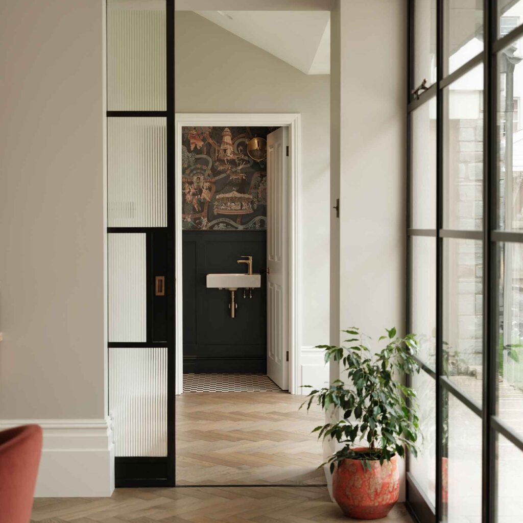 Throughout the ground floor, herringbone flooring creates a natural thread between spaces, while calm neutrals in the circulation areas are lifted by stronger, characterful tones in the main rooms.