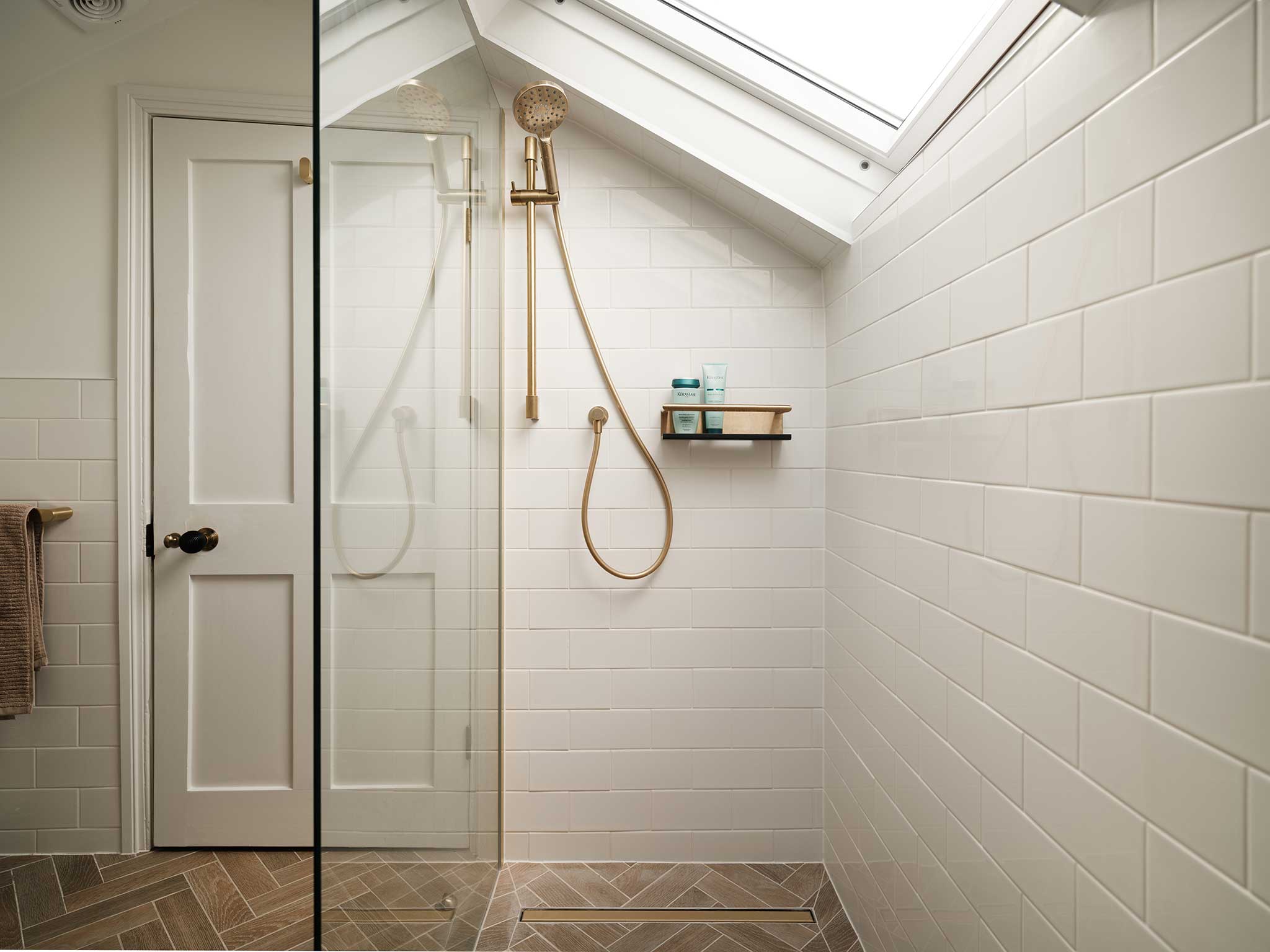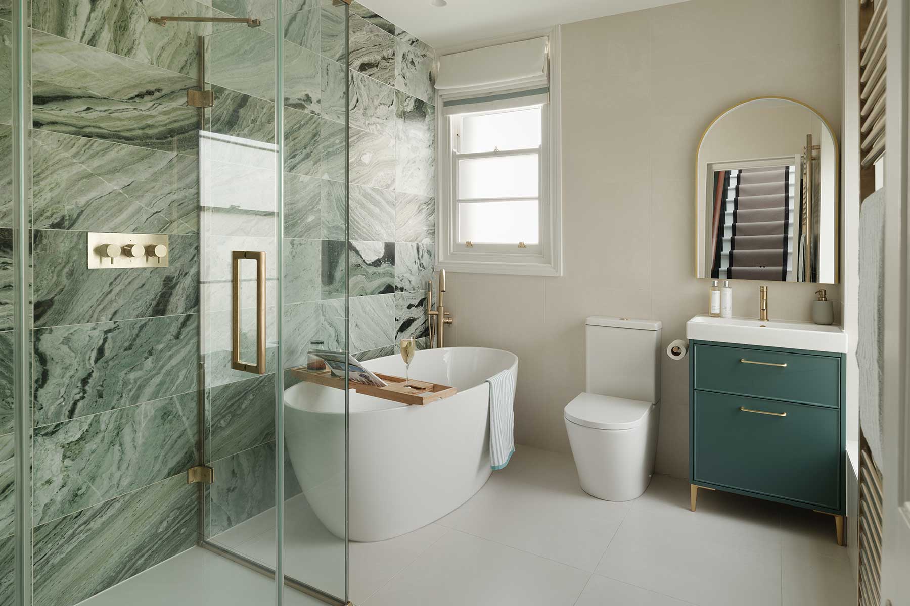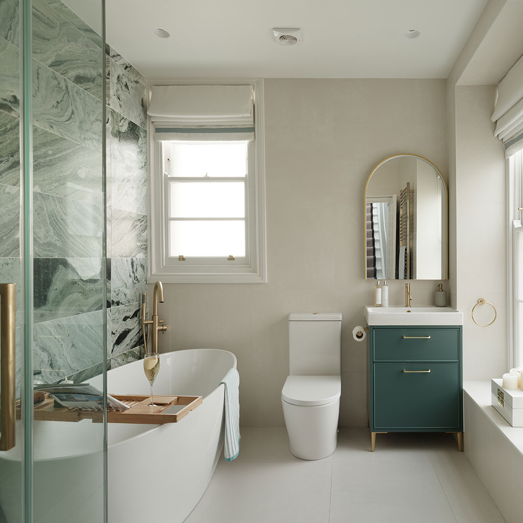 With compact bathrooms, it’s tempting to default to all-white tiles in the hope of creating the illusion of space. In reality, we find that bold materials can be more effective, drawing the eye away from the dimensions and giving the room a strong sense of character. Here, a 1600mm freestanding bath allowed us to retain a generous shower, while a mix of green marble tiles delivered instant wow.