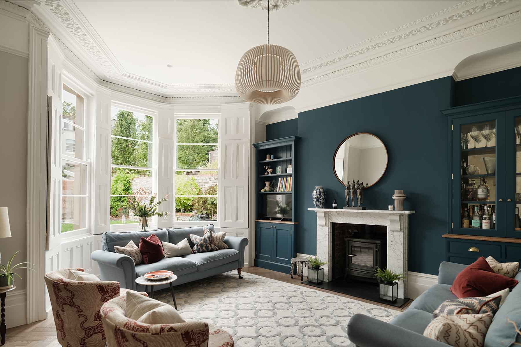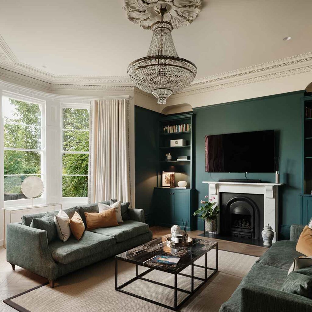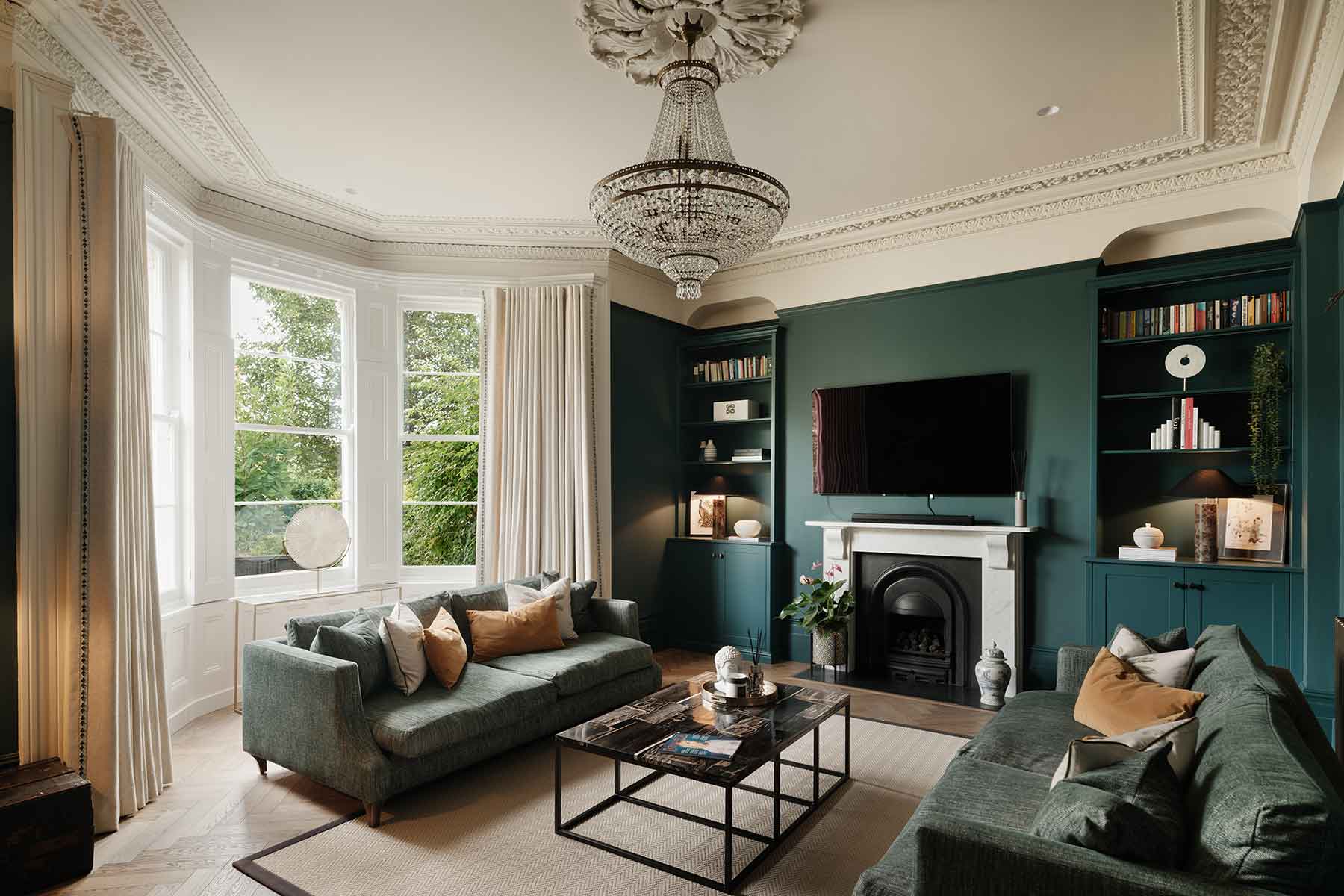 If we could play favourites, the living room would be our top pick. From the generous proportions to the restored ornate coving, there’s so much to love about this space. We knew we ought to create something special, starting with the use of colour. We searched high and low before settling on an archive shade from Mylands.