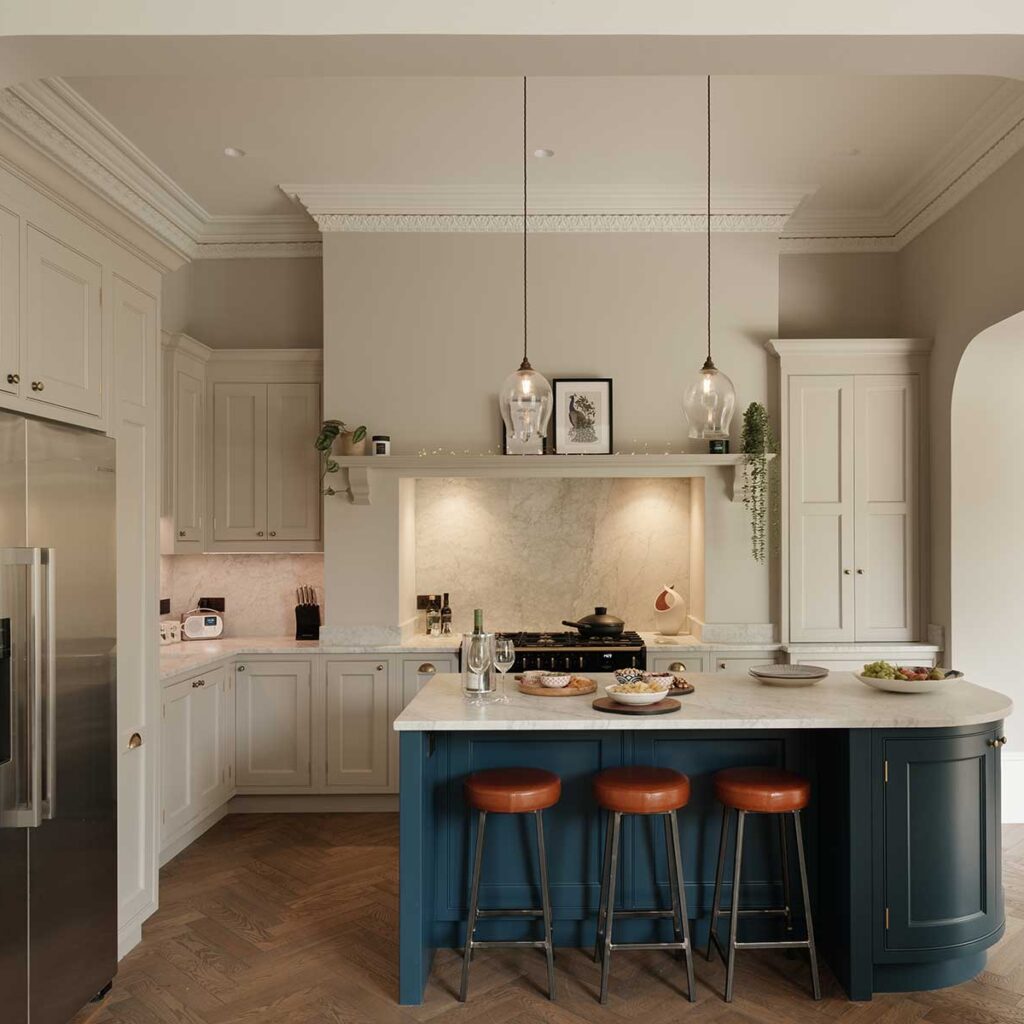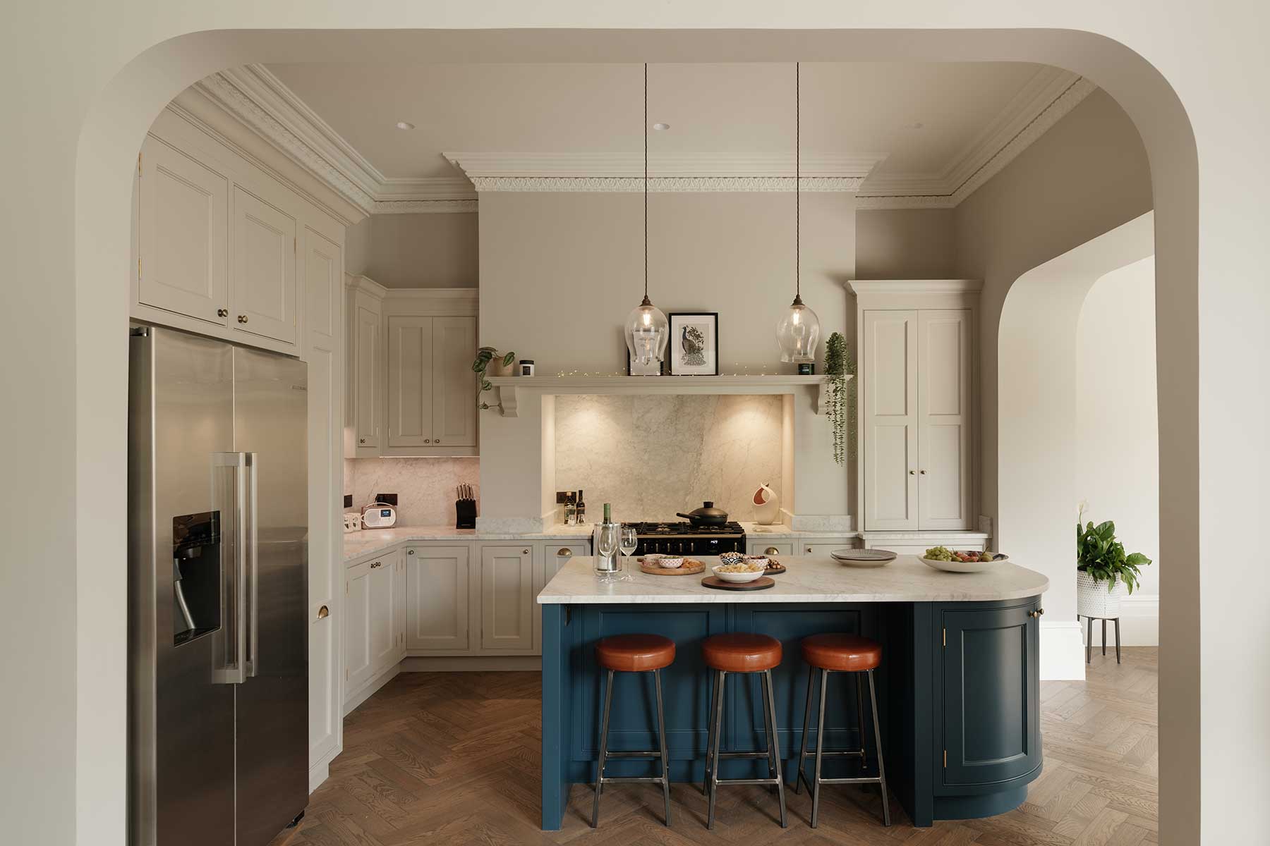 The Heart of the Home: the kitchen and dining space. Typical of Victorian homes, the kitchen was a little compact in proportion to the other ground-floor spaces. It was a delicate balance of practicality — how to create enough worktop space without compromising circulation around the island. A few layouts were developed, each helping to form the final brief to the kitchen maker.